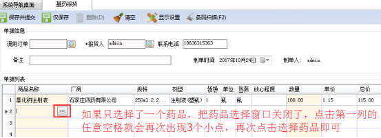 方案一:選擇一個(gè)藥品之后藥品選擇頁(yè)關(guān)閉了,一張報(bào)貨單就只有一個(gè)藥品了,其實(shí)不是哦,第一列的背景是淡黃色,點(diǎn)擊下面的任意空格,就會(huì)再次出現(xiàn)3個(gè)小點(diǎn),藥品選擇頁(yè)也會(huì)再次出現(xiàn),就可以多次勾選。