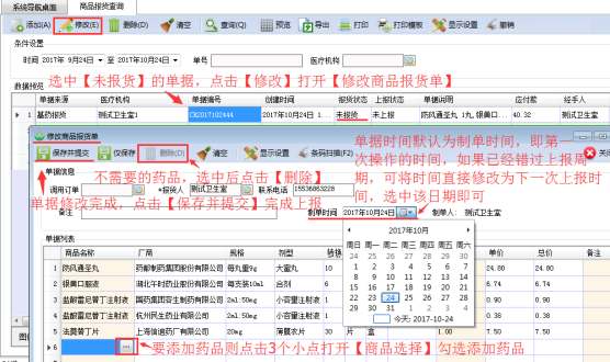 選中【未報(bào)貨】的單據(jù),點(diǎn)擊左上角的【修改】按鈕,打開(kāi)【修改商品報(bào)貨單】;在【修改商品報(bào)貨單】頁(yè)面,選中錯(cuò)誤或者不需要的藥品,點(diǎn)擊【刪除】;需要添加藥品則點(diǎn)擊3個(gè)小點(diǎn)打開(kāi)【商品選擇】繼續(xù)勾選藥品;單據(jù)修改編輯完成后點(diǎn)擊左上角的【保存并提交】完成上報(bào);*制單時(shí)間默認(rèn)為第一次操作的時(shí)間,如果是之前做的采購(gòu)計(jì)劃或者是撤回的單據(jù),日期都是不變的,有可能會(huì)錯(cuò)過(guò)上報(bào)周期,建議將日期修改成今天或者是下一次上報(bào)周期*